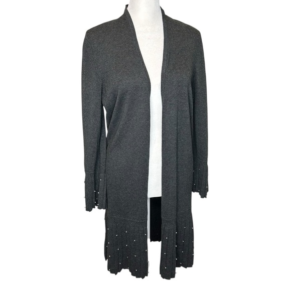 Chico's Cardigan Sweater Duster Faux Pearl MED Pleated Mid-Length Gray