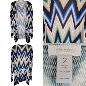 Chicos Cardigan Sweater Rayon Women's Size 2 US Large LS Open Front Blue Chevron