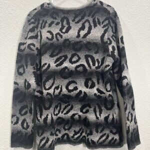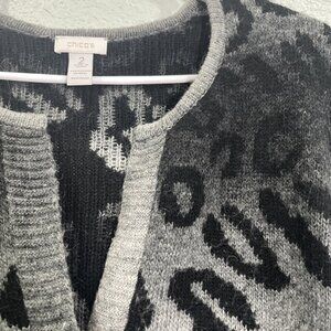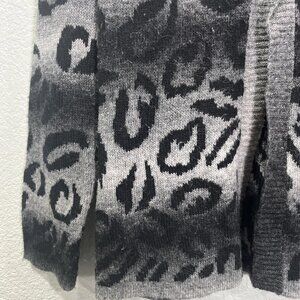 Chicos Cardigan Sweater Womens 2 Large Gray Black Leopard Knit Split Neck Fuzzy