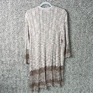 Excellent used Condition Women’s Chico’s Neutral Tan Brown Chevron Patterned Knit 3/4 Sleeve Long Open Front Cardigan Sweater in Size 3 / XL / 16