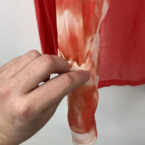 Chico's Cardigan Women Sz 2 Large Coral Watercolor Chiffon Open Front Long sleeve Sheer. Lightweight Knit Shrug. 2 front pockets. Casual. Front Panel: 100% Polyester. Back Panel/Sleeves: 88% Rayon, 12% Nylon.