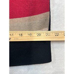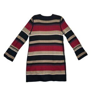 This versatile cardigan and dress set from Chico's combines comfort and style. Featuring striking black, red, and tan stripes, it's designed for effortless chic.
