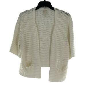 Chico's Cardigan Women's Size Medium (Chico's Size 2) 3/4 Sleeves Collarless Knit Crochet Button Front Pockets Top