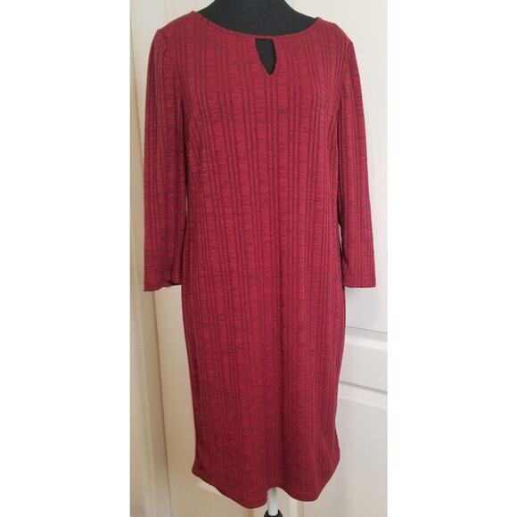 Chico's Career Casual Heathered Ribbed Knit Detail Red Dress Women's - Size 0 (S/4); Material - Polyester, Rayon, Spandex,; Care - Machine Wash; Made in Vietnam; Round Neckline with Keyhole in Front, Red / Black Heathered Pattern, 3/4 Raglan Length Sleeves, Knee Length, Shift, Sheath Pencil Style, Sliming, Lined Stretch Material, Occasion - Business, Casual, Party/Cocktail, Travel, Vacation, Weddings, Church, pullover closure and collarless design make it easy to wear.