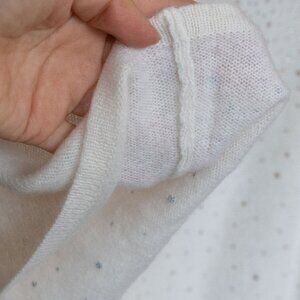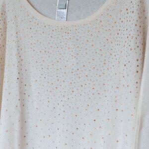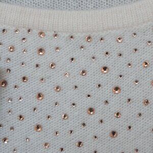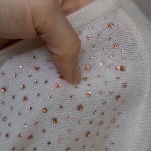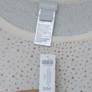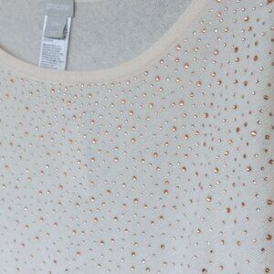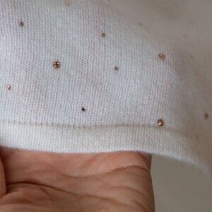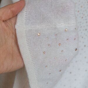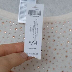 Chicos Cashmere Poncho Sweater Rhinestone Ivory Asymmetrical Wool Bedazzled, size small. NWT new with tags. This is a bedazzled 100% Cashmere poncho in an off white crem color. The jewels are rose gold. It has a quiet luxury style that is perfect for any formal occasions or night out.