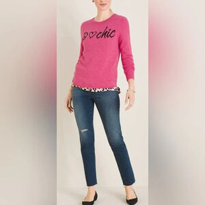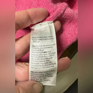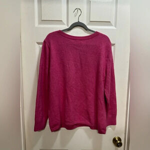 This is a listing for a preowned Chicos Cashmere-Blend Peace Love Chic Sweater Long Sleeve Hot Pink Size 3 US XL. There is pilling on arms and middle body area, shown in photos. Otherwise good condition, approximate measurements in photos. Please see all photos for details as they are part of the description.