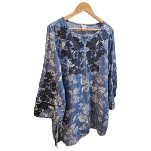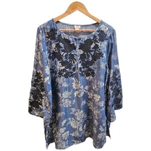 Chico's Chambray Embroidered Denim Tunic Top Size 16 18 Floral Silky Soft Light