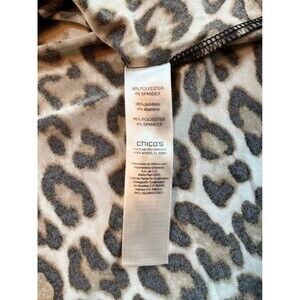 Chico's tunic top featuring an all-over leopard print. Three-quarter length sleeves and an asymmetrical hem. Print consists of tan and brown leopard spots on a cream background, a popular and timeless design choice for apparel.