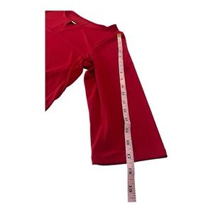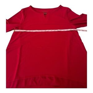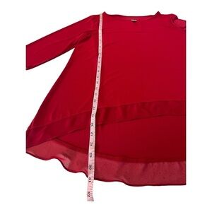 Easy to Wear Vivid Red Bright Packable Solid Business Casual By Chicos Holiday Red Ruffle Sheer Trim high low hem Valentines Day Red Top