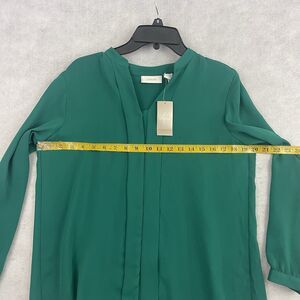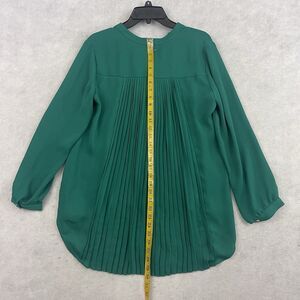 This Chico's blouse is a timeless piece that will fit any occasion. The gallant green color and pleated accents add a touch of elegance to the blouse, making it perfect for both casual and formal events. The relaxed fit and flowy tunic design ensure comfort and ease of movement, while the 100% polyester material is lightweight and breathable, making it ideal for summer, fall, and spring seasons. The blouse is machine washable and easy to care for, making it a practical addition to any wardrobe. The blouse is available in size 0 (US XS) and has a pullover closure.