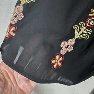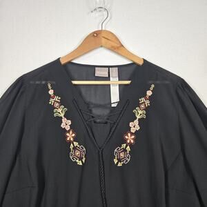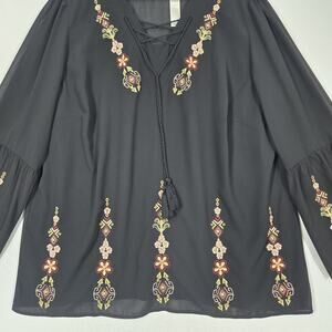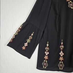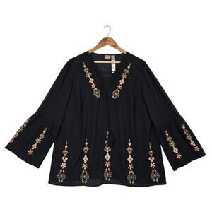 Chico's Chiffon Peasant Top sz 3 (XL) Black Embroidery Bell Sleeve Tassel Ties
