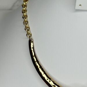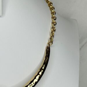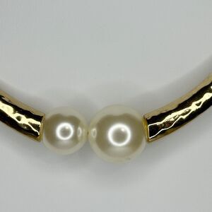 Absolutely stunning collar necklace that screams sophisticated elegance! Two gorgeous faux pearls anchor this chic piece with a textured center section and gold-tone chain links.