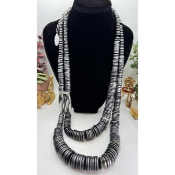 Chicos Chunky Metallic Gray SilverTone Disk Rhinestone Statement LayeredNecklace