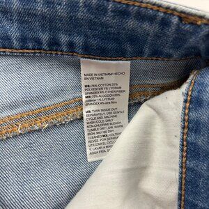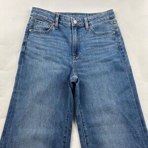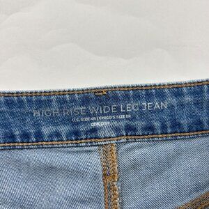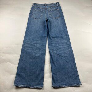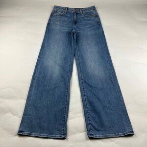 Excellent used condition, cotton stretch blend classic blue jeans have no notable signs of natural wear or overuse. 5 pockets, zip front, belt loops, high rise, wide legs. Size 0 Regular, please reference measurements for sizing & fit inquiries.