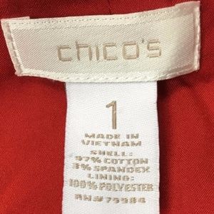 Open front color block blazer or jacket with abstract print by Chico’s. Has two small, zippered pockets and red lining. The colors are bright red, black, grey, white, and cream. 97% cotton and 3% spandex with 100% polyester lining. Chico’s size 1 which usually corresponds to a regular size M. Measures about 19 inches across from armpit to armpit and 19 inches in length. Sleeves are about 22.5 inches long. B8