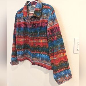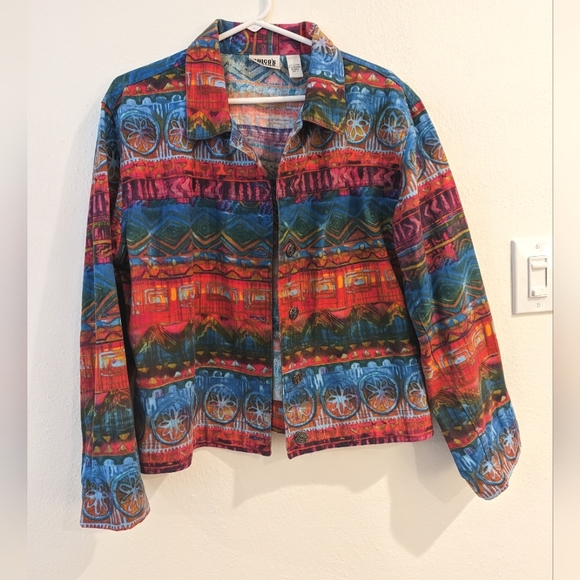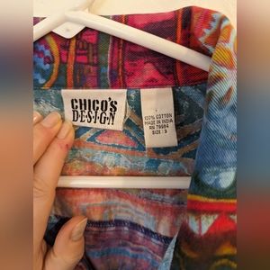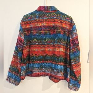 Gorgeous rainbow, colorful, patterned denim-like jacket by Chico's, size 3 which is an XL. Cute silver buttons, no size of wear.
