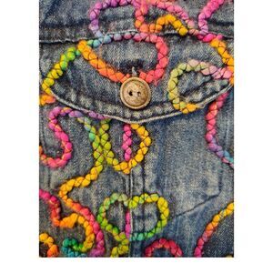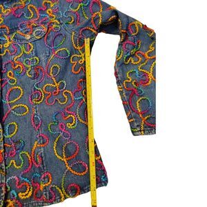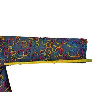 Chico's Colorful embroidered Long Sleeve Blue Denim Jacket, an eye-catching Artwork on a jacket. The jacket is in a size M/8, women's.
