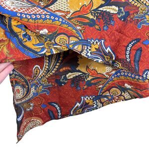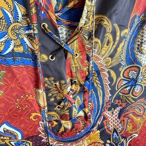 Excellent preowned condition. Colorful paisley print satin long sleeve asymmetrical hem pullover tunic blouse. Lace up tie detail on front. Polyester material. Approx. measurements: Shoulder to hem 23-35", pit to pit 19", sleeve from neck to sleeve hem 27". Size 0 (S).