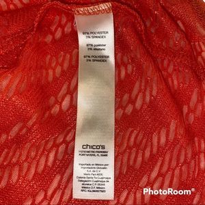 Chico’s Coral Red Orange Semi Sheer Patterned Asymmetric Hem Top 3 XL 16 EUC