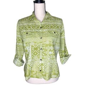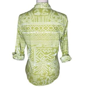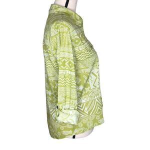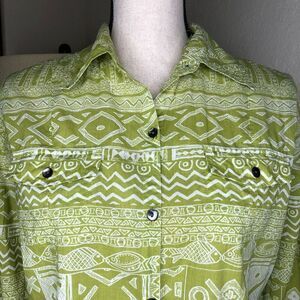 Nice, lightweight blouse in a fresh green and white cotton Aztec inspired print. In excellent condition.