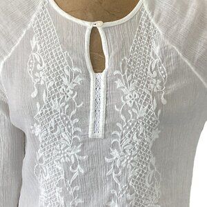 Description: Chico's 100% Cotton Stretch Gauze Embroidered BOHO Peasant White Noise Top, Keyhole Button Neck, Side Slits.
