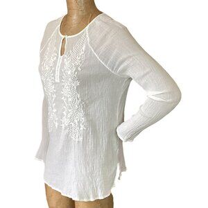 Chico's Cotton Gauze Embroidered BOHO Peasant White Noise Top is a regular fit tunic blouse made of 100% cotton gauze fabric. It features a round neckline with a keyhole neck and button closure, long sleeves, and embroidered accents. The white blouse is collarless, unlined, and lightweight, making it breathable and perfect for summer and spring. It is machine washable and packable, making it easy to care for and travel with. The blouse is ideal for casual, business, party/cocktail, and travel occasions, and has a bohemian, gypsy, 60s 70s festival, hippie, and peasant theme.