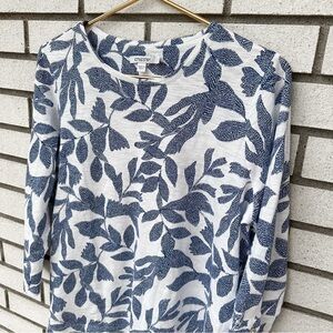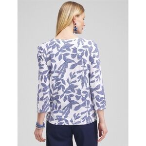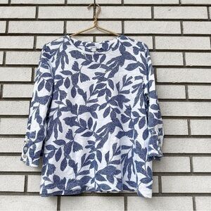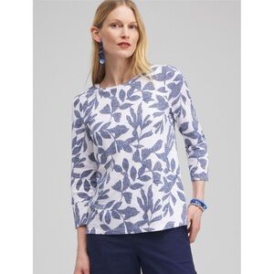 Chico’s Cotton Slub Leaf Print 3/4 Sleeve Button Tee Blue White