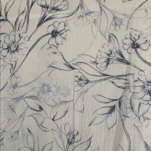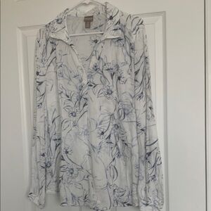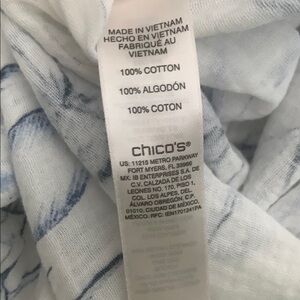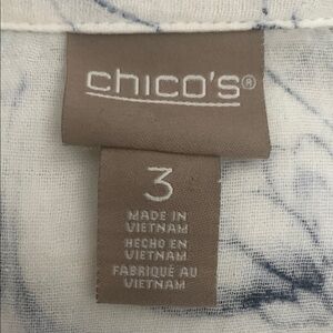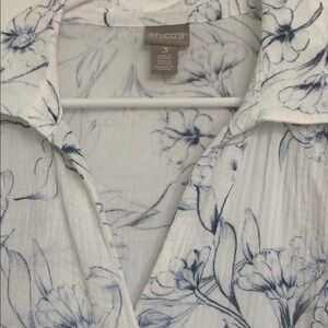 Elegant white blouse with blue floral design by Chico’s.  100 percent  cotton. Perfect for any occasion. Size 3 is 16/18 in Chico’s.  Excellent condition.  No rips or stains. Armpit to armpit is approx 24 inches.  (See photos)