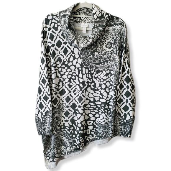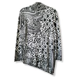Chico's Cowl Neck Asymmetric Hem Sweater L 2 Paisley Gray White Artsy Lagenlook