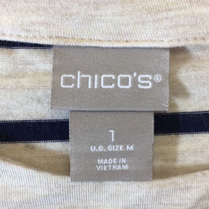 Chico's Cream Blue Striped 3/4 Sleeve Tee Womens 1 Medium T Shirt. Ruffled sleeve. 96% Rayon, 4% Spandex. Pre-owned Condition- no flaws, no rips, stains, or holes.