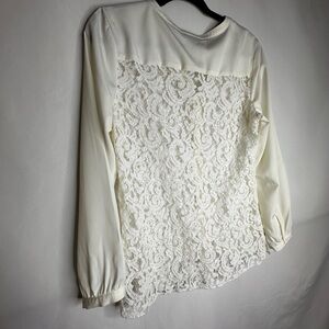 This elegant cream blouse from Chico's showcases a mandarin collar and long sleeves, adorned with intricate embellishments for a refined touch. The buttoned front adds a classic element, making it a versatile choice for both casual and formal settings.