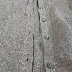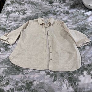 Elevate your wardrobe with this relaxed button-down linen shirt from Chico's, featuring a notched collar and cuffed sleeves. Linen with gold threds - this top offers a polished yet casual look. Its airy fabric and minimalist design make it perfect for warm weather occasions. Perfect for vacation. Easy to dress up or down. Great used condition. Smoke free home