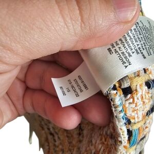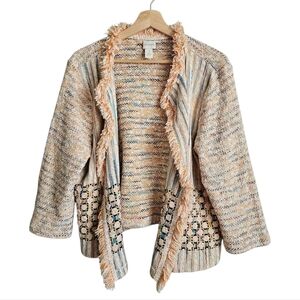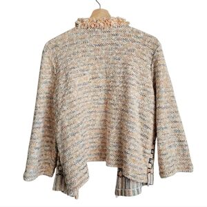 Chico's Cream and Tan Sweater Open Jacket with Colorful Tweed Ruffled Trim