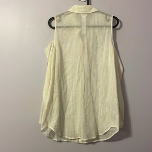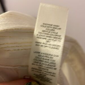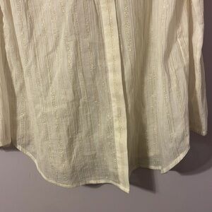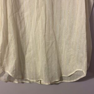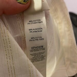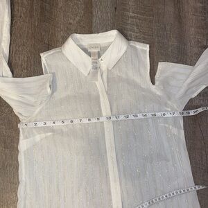 Chico’s Cream with Metallic Gold Stripe Cold Shoulder Long Sleeve Button Blouse size 0 (4/S). Very good preowned condition. Pointed collar. Hidden shell buttons down front. Very lightweight. Semi sheer look. See pictures for approximate measurements. Off white color with think gold metallic thread stripes.