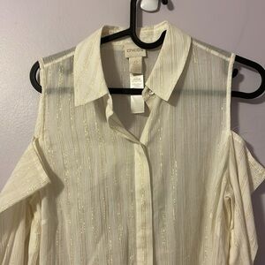 Chico’s Cream with Metallic Gold Stripe Cold Shoulder Long Sleeve Button Blouse