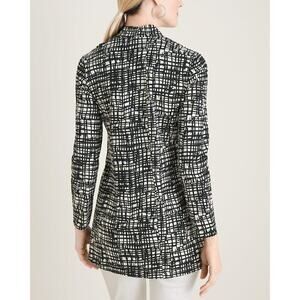Chico's Criss-cross print tunic top in women's size 2, equivalent to a size large. Black and white pima cotton. Long sleeves. V-neckline. Straight hem. Classic fit. Like new condition.