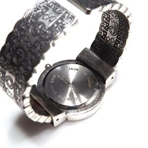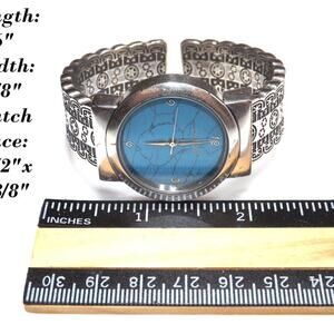 This is a beautiful older Chico's cuff watch with a faux turquoise stone face and a silver tone engraved front and back cuff band. I believe the watch is vintage and has Japanese Movement stamped on the back of the watch, along with stainless steel back. The watch has a 12, 3, 6, and 9 face and is stamped Chico's. I have replaced the battery and it works great. I have pulled to stem to save the battery, however, with time the stem gets pushed back in and could start ticking again. You may receive the watch without a working battery if the stem gets pushed back in. At this point, the battery is saved. The watch shows some wear around the edges of the watch face. You should preview every photo as they are a part of the description.