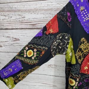 Chico's D.E.S.I.G.N - Women's Multicolor Silk Blend Patchwork Sequins Beaded Embroidered Art To Wear Button Front Long Sleeve Blazer Jacket Size 3. Shell 100%Rayon. Lining 100%Cotton. Embroidery Silk, Rayon, Metallic, Nylon Fabrics. Approx. measurements pit to pit 23 in. 22 in. Jacket length 26 in. Some bead missing, barely noticeable. Pre-owned in good condition, no holes or stain.