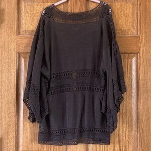 Chico’s dark brown open cardigan sweater with drape-like square sleeves. Missing all but the top most button on the front, but the loop style of the button “holes” in addition to the open knit pattern make that nearly unnoticeable. A few small pulled threads. Size 2 = Large/12
