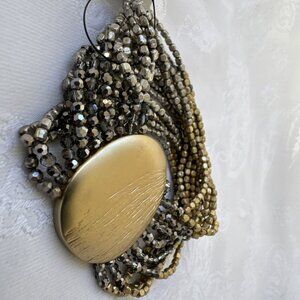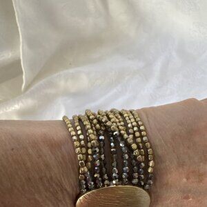 Wide stretch bracelet with goldtone hardware. Metallic dark gold/silver in color. Pull on style with tiny beads. New with tags. From a smoke free home.