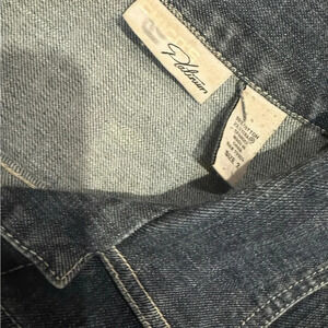 Chico’s denim jacket, Chico’s pleated jacket, women’s size 2 Chico’s, dark wash jean jacket, button front denim coat, Chico’s outerwear, structured denim jacket, casual layering piece