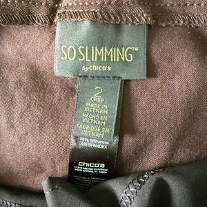 Chico's ankle-length pants in deep burgundy. Sleek and stylish design. Perfect for versatile wear.