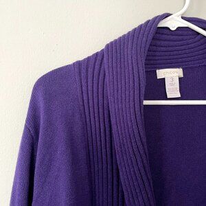 Elegant deep purple cardigan. Features ribbed detailing. Perfect for layering.