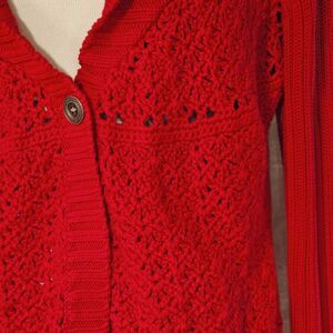 Chico's Deep Red Knit & Crochet Button Front Heavyweight Deep V- Neck Sweater