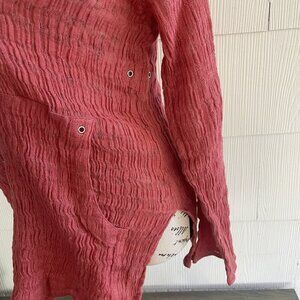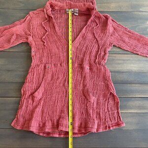 Grab this stunning salmon-colored, deep V-neck, scurunchy hoodie from Chico's, perfect for women in size 0 which translates roughly to a size S.