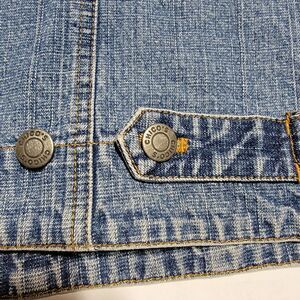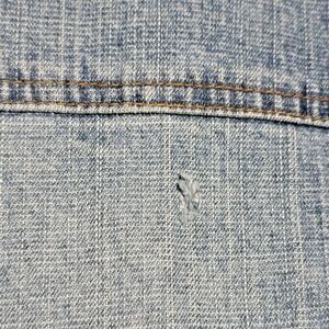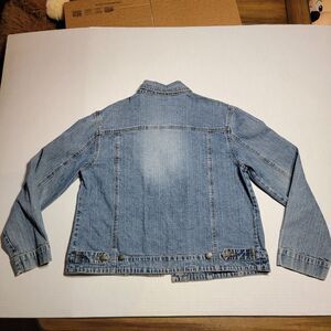 Chico's Denim Jean Jacket - Size 1. There is a tiny hole in the back of the jacket in the center under the seam going across. See picture. Other than that minor flaw, the jacket is in great condition. Comes from a smoke free home.
