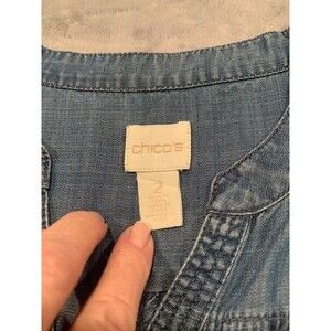 Chico's Women Size 2 Blue Denim Chambray Popover Top with Bell Sleeves. Cottage Core Bolo Bohemian