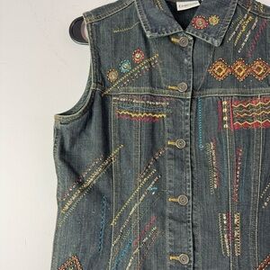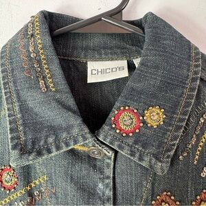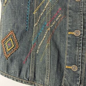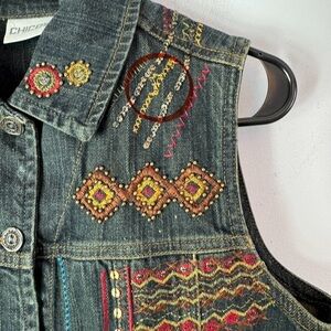 Chico’s Denim Vest Size 0 Embroidered Embellished Button Up Dark Blue