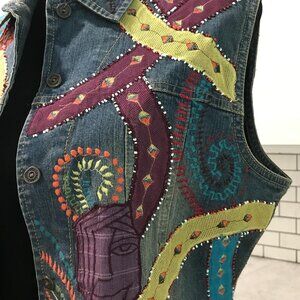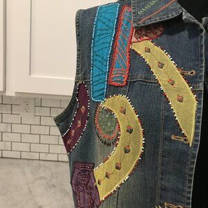 Features: collared sleeveless vest; button-front closure; multicolor stitched appliques with bead-like accents; artistic face/mask motifs; boho artsy statement style