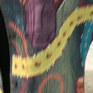 Color: Blue denim with purple, yellow, teal, orange, and green accents